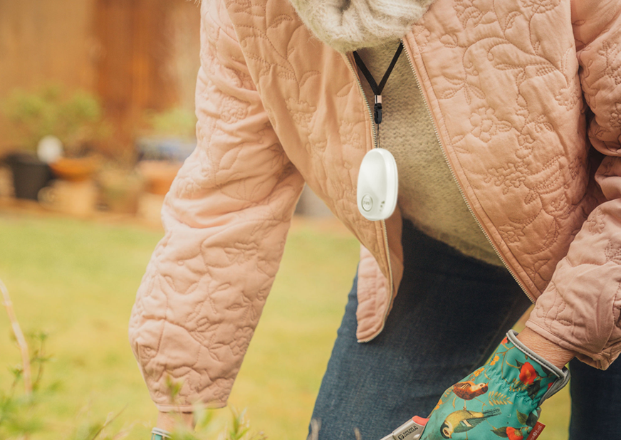 Pendant with fall detection providing peace of mind at home or on the go.